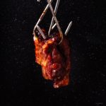 When ready to cook, heat the oven to 300°F. Line a rimmed baking sheet with tinfoil. Remove the pork from the marinade, shaking off excess. Lay the pork on a wire rack on a rimmed baking sheet and bake for 1 hour, flipping halfway through.